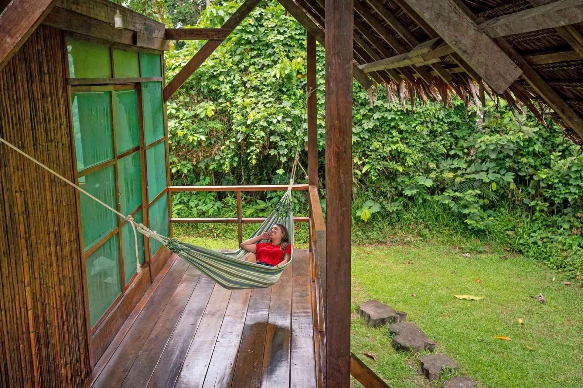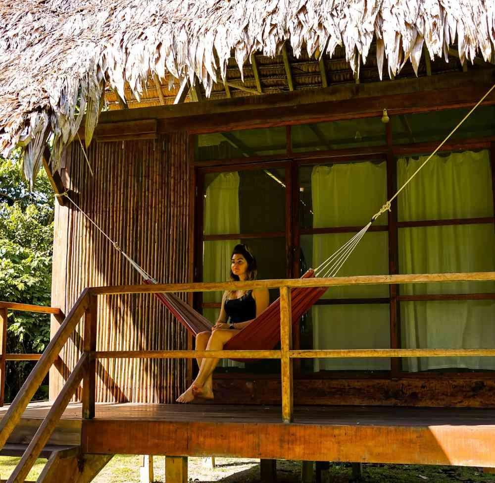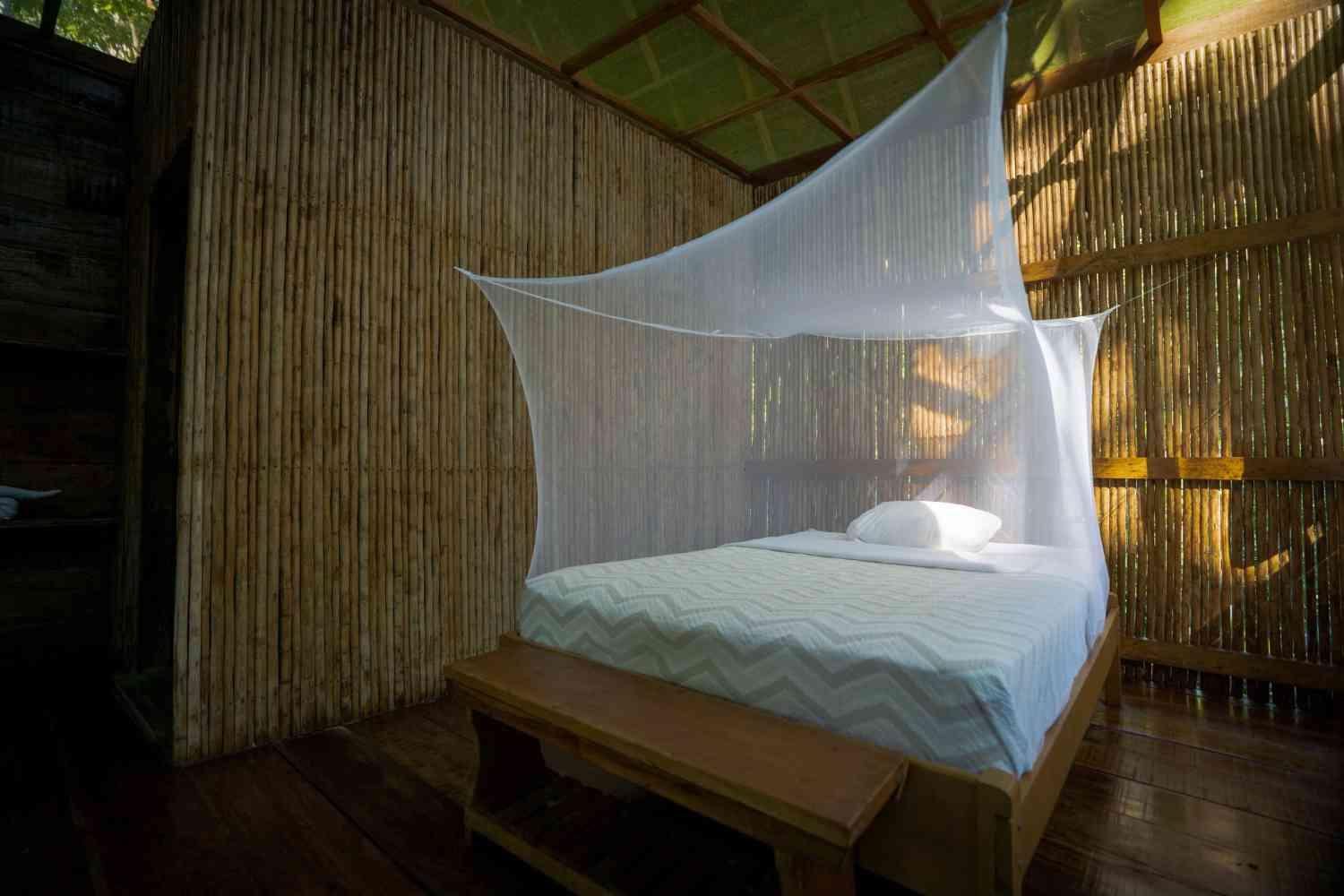 Cabaña para 1 o 2 personas con una cama matrimonial (2 plazas) equipada con mosquitero. Cuenta con baño privado con ducha y una terraza con hamaca para relajarse. La cabaña está protegida con malla mosquitero, permitiendo disfrutar de la visibilidad del entorno natural.