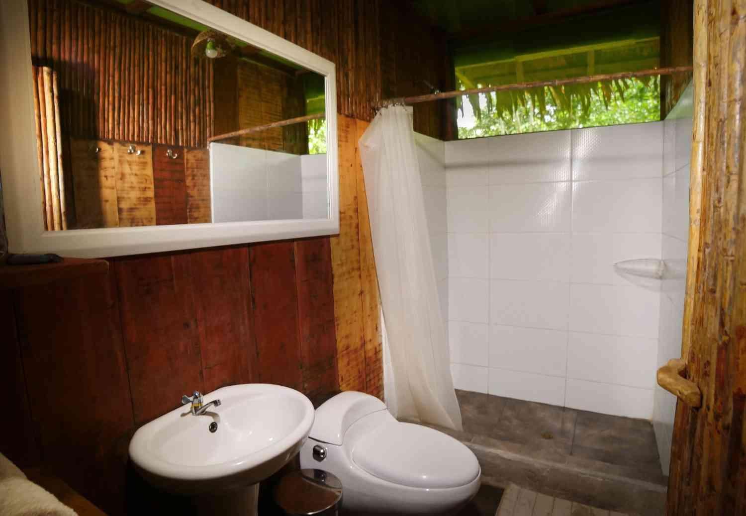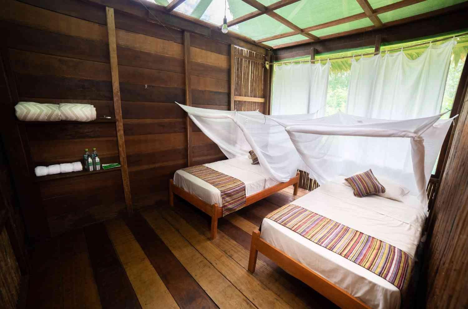 Cabaña para 5 o 6 personas, con 4 camas twin ( plaza y media) y 1 matrimonial (2 plazas) ó 2 camas twin y 2 camas matrimoniales de 2 plazas. Todas con mosquitero. Baño privado con ducha. Terraza con hamaca para descanso. Cabaña protegida con malla mosquitero, permite visibilidad del entorno natural.